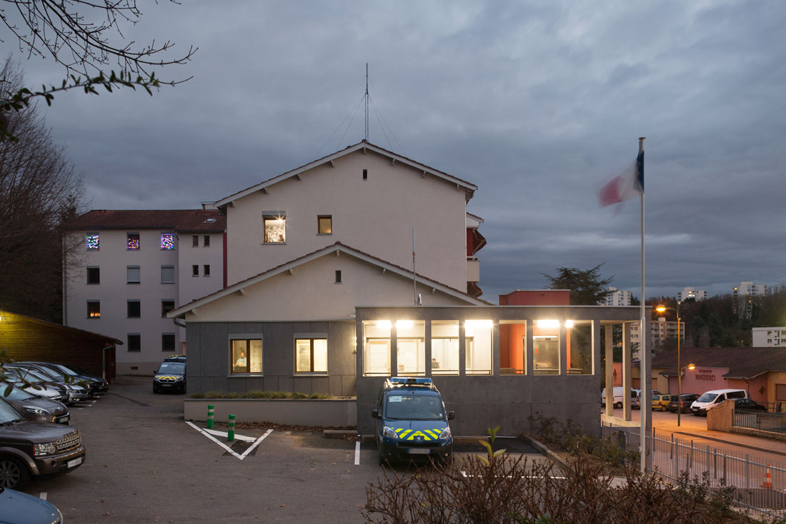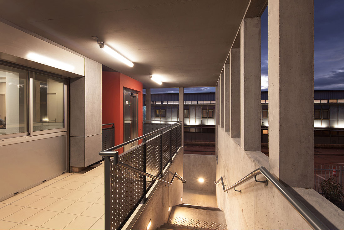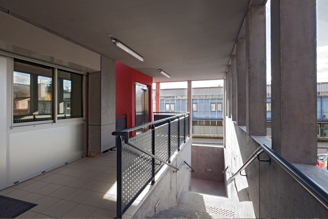 Par son volume très particulier, le bâtiment se différencie par rapport au contexte environnant de logements et exprime ainsi clairement son caractère d’accueil du public.