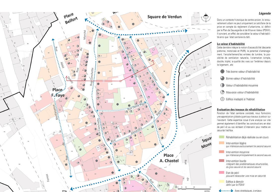 ne peut uniquement se satisfaire de la prise en compte du règlement d’urbanisme, ici défini par le Plan de Sauvegarde et de Mise en Valeur (PSMV). Inscrit dans la continuité des études menées lors de l’élaboration du PSMV, nous avons interrogé la notion d’habitabilité sur l’ensemble des secteurs pressentis pour le projet.