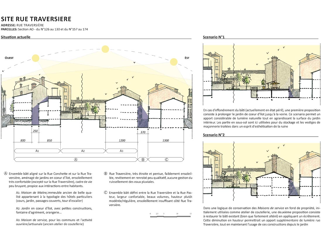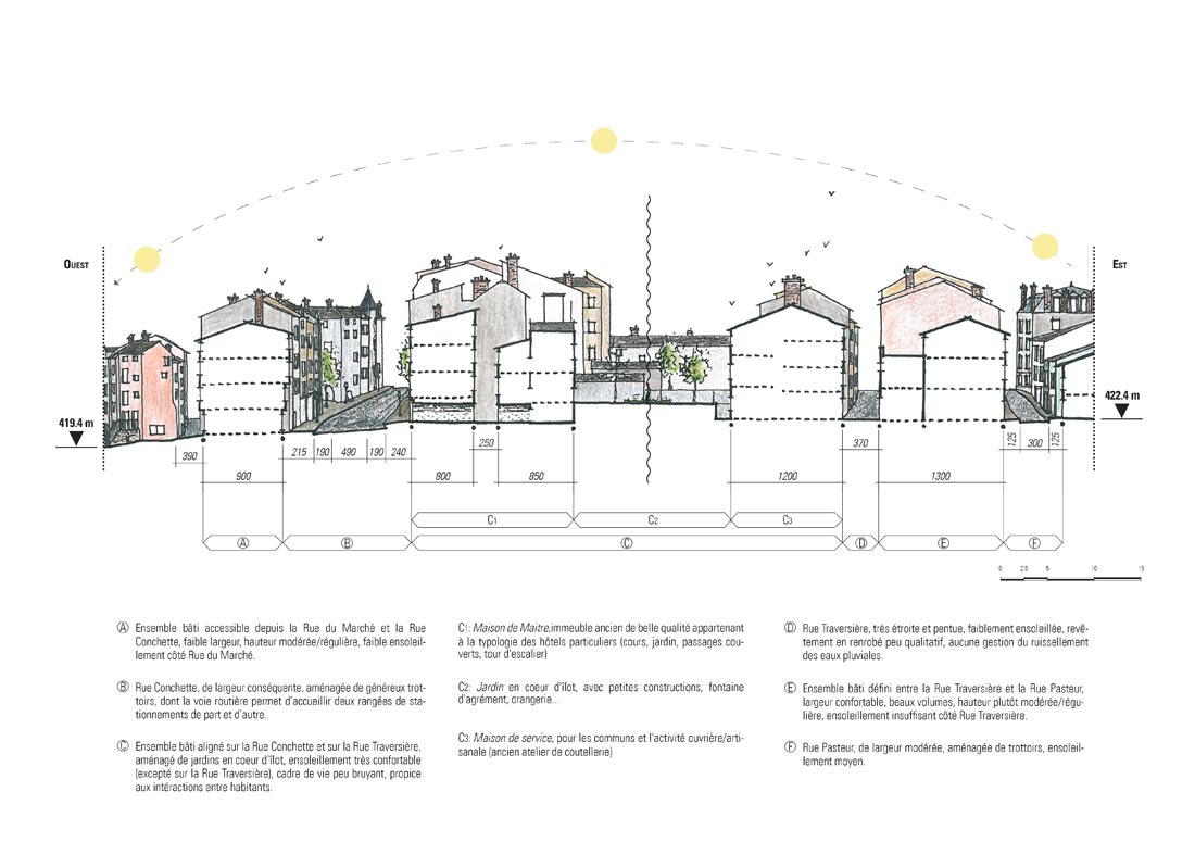 Dans un contexte historique de centre ancien comme celui de Thiers, le renouvellement urbain ne peut uniquement se satisfaire de la prise en compte du règlement d’urbanisme, ici défini par le Plan de Sauvegarde et de Mise en Valeur (PSMV). Inscrit dans la continuité des études menées lors de l’élaboration du PSMV, nous avons interrogé la notion d’habitabilité sur l’ensemble des secteurs pressentis pour le projet.